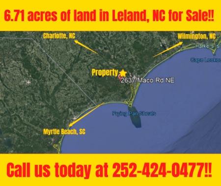 Own 6.71 acres of gorgeous land in Leland, NC, originally selling for $44,997, now just $24,997—half the market value of nearly $48,000!! Drive up to 2637 Maco Rd NE in Leland, NC, and feast your eyes on 6.71 acres of beautiful potential. The previous owners cleared the land, but it is a little overgrown now—the perfect blank canvas for you to make this property your own. Buy the land that YOU deserve for just $35,997, and make your dreams come true!! Call us today at 252-424-0477!